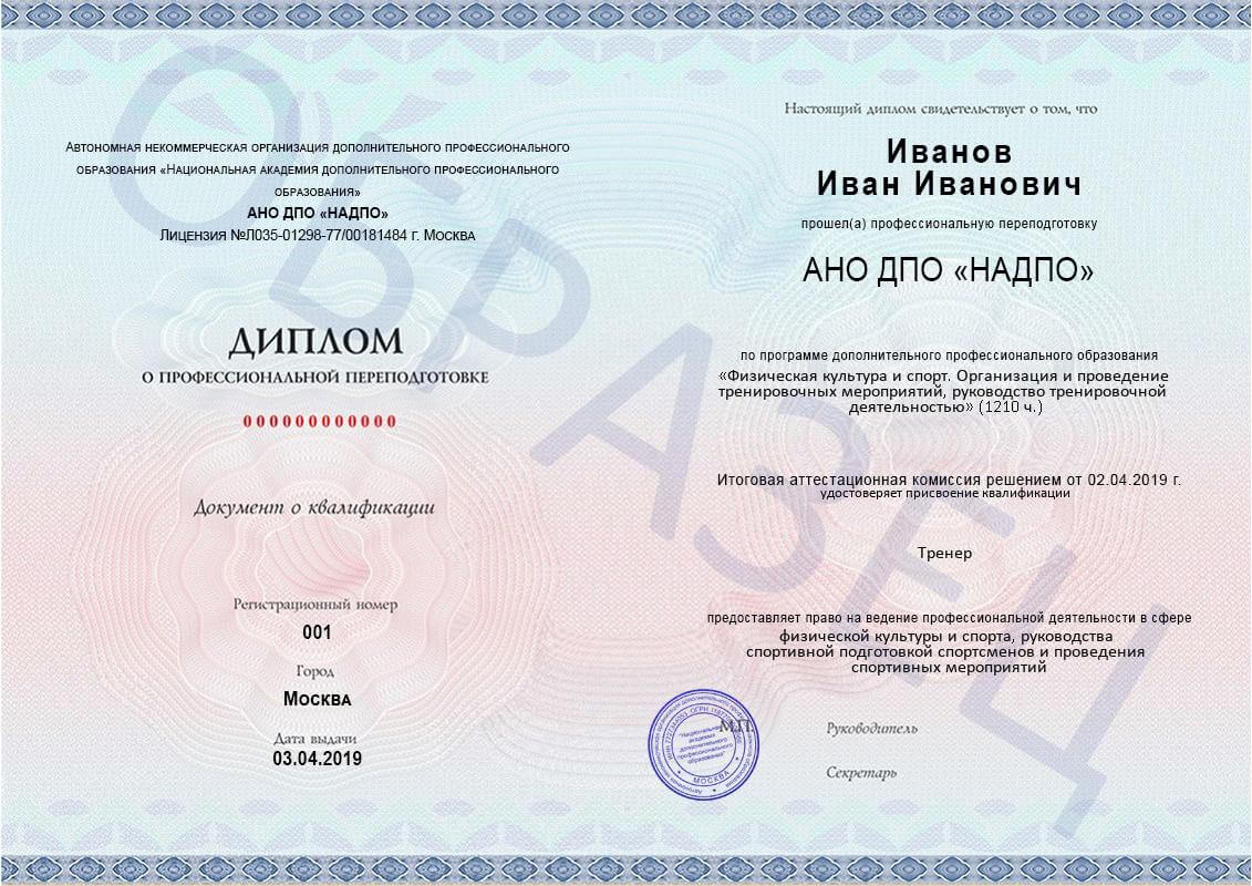 «Физическая культура и спорт. Организация и проведение тренировочных мероприятий, руководство тренировочной деятельностью» с присвоением квалификации «Тренер»