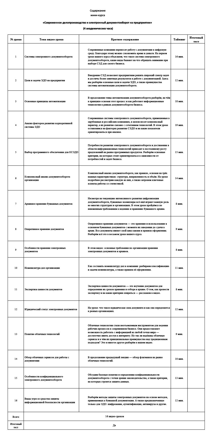 № урока | Тема видео-урока | Краткое содержание | Тайминг | Итоговый тест | ||