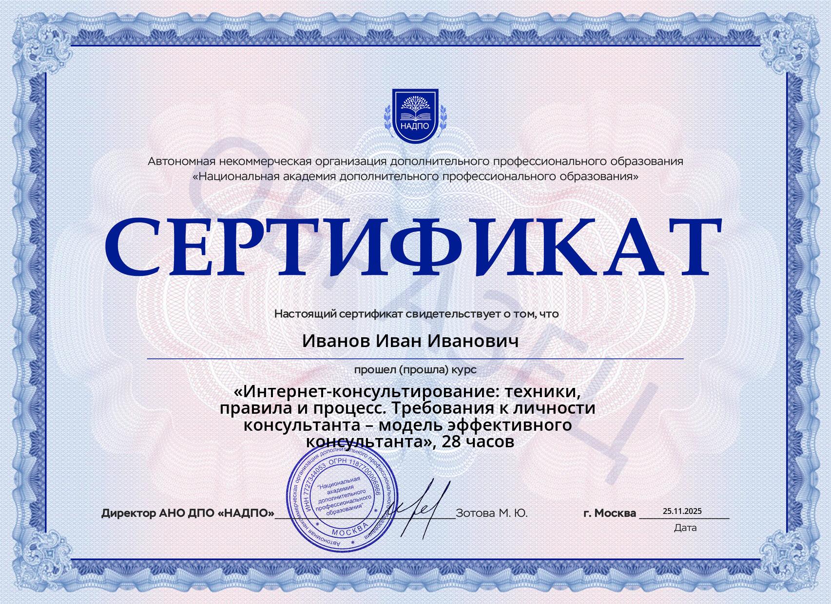 После окончания обучения и сдачи итогового теста вы получите электронный сертификат о прохождении курса.