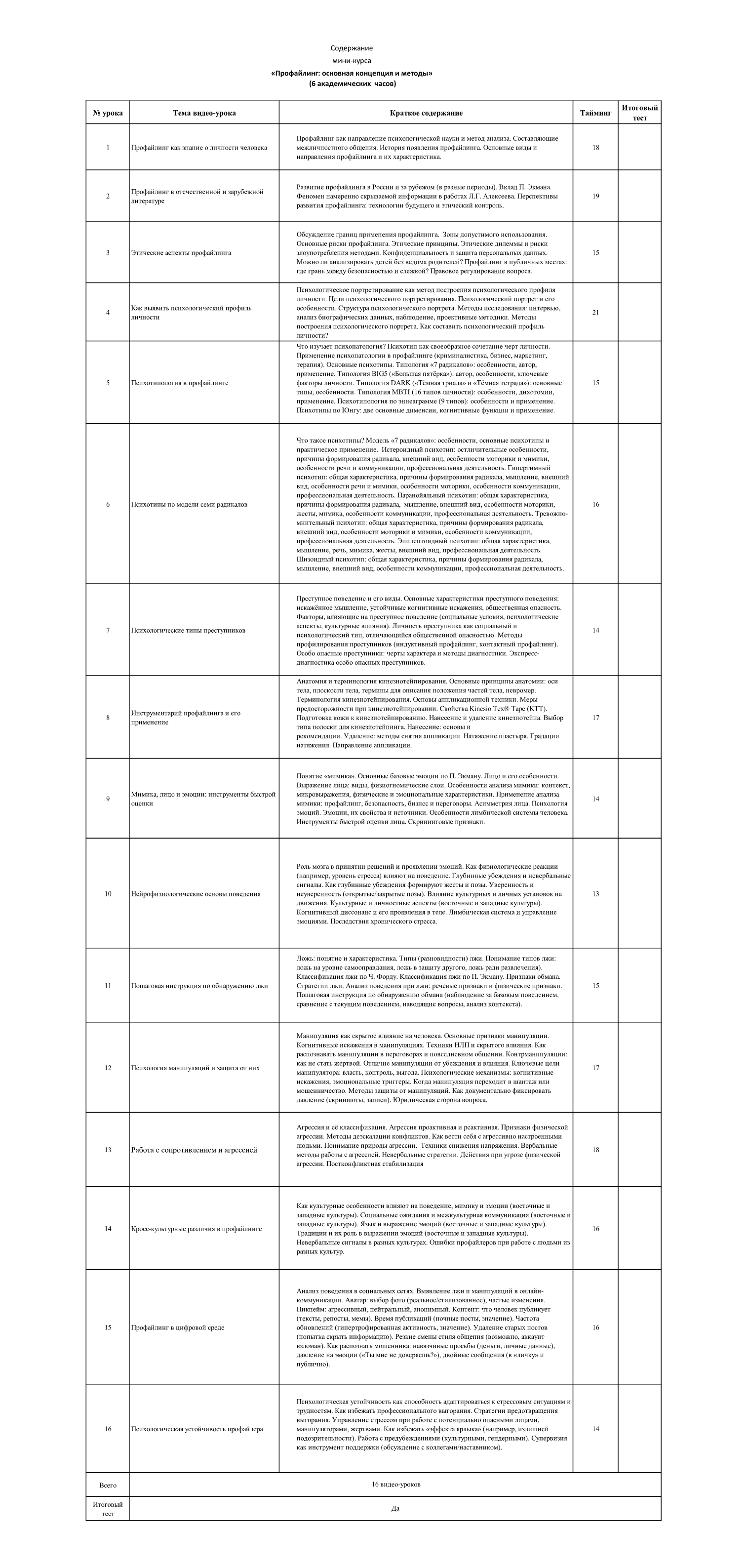 Кросс-культурные различия в профайлинге | Как культурные особенности влияют на поведение, мимику и эмоции (восточные и западные культуры). Социальные ожидания и межкультурная коммуникация (восточные и западные культуры). Язык и выражение эмоций (восточные и западные культуры). Традиции и их роль в выражении эмоций (восточные и западные культуры). Невербальные сигналы в разных культурах. Ошибки профайлеров при работе с людьми из разных культур. | 16 | |||