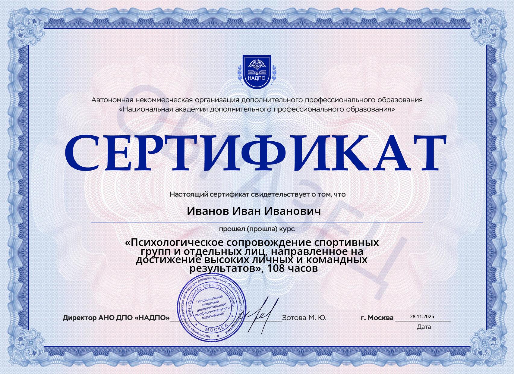 Программа подготовлена преподавателями-специалистами, которые готовы поделиться своими знаниями и помочь освоить не только теоретическую, но и практическую специфику курса. Для комфортного обучения из любого города Национальная академия дополнительного профессионального образования предоставляет возможность дистанционного обучения. Вы сможете проходить курсы по психологическому сопровождению спортивных групп и отдельных лиц в любое удобное для вас время.