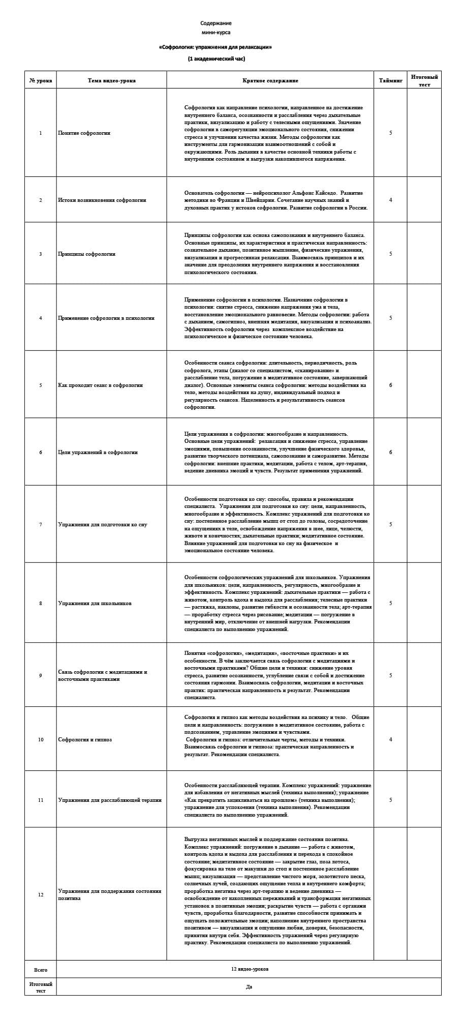 «Софрология: упражнения для релаксации» — это уникальный образовательный ресурс, который поможет вам освоить практики саморегуляции, научиться применять упражнения для снижения стресса и восстановления эмоционального равновесия.